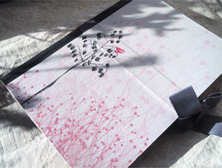 Keményfedeles, saját gondolattal nyomtatott, ragasztott, textilgerincű és szatén szalaggal megköthető.