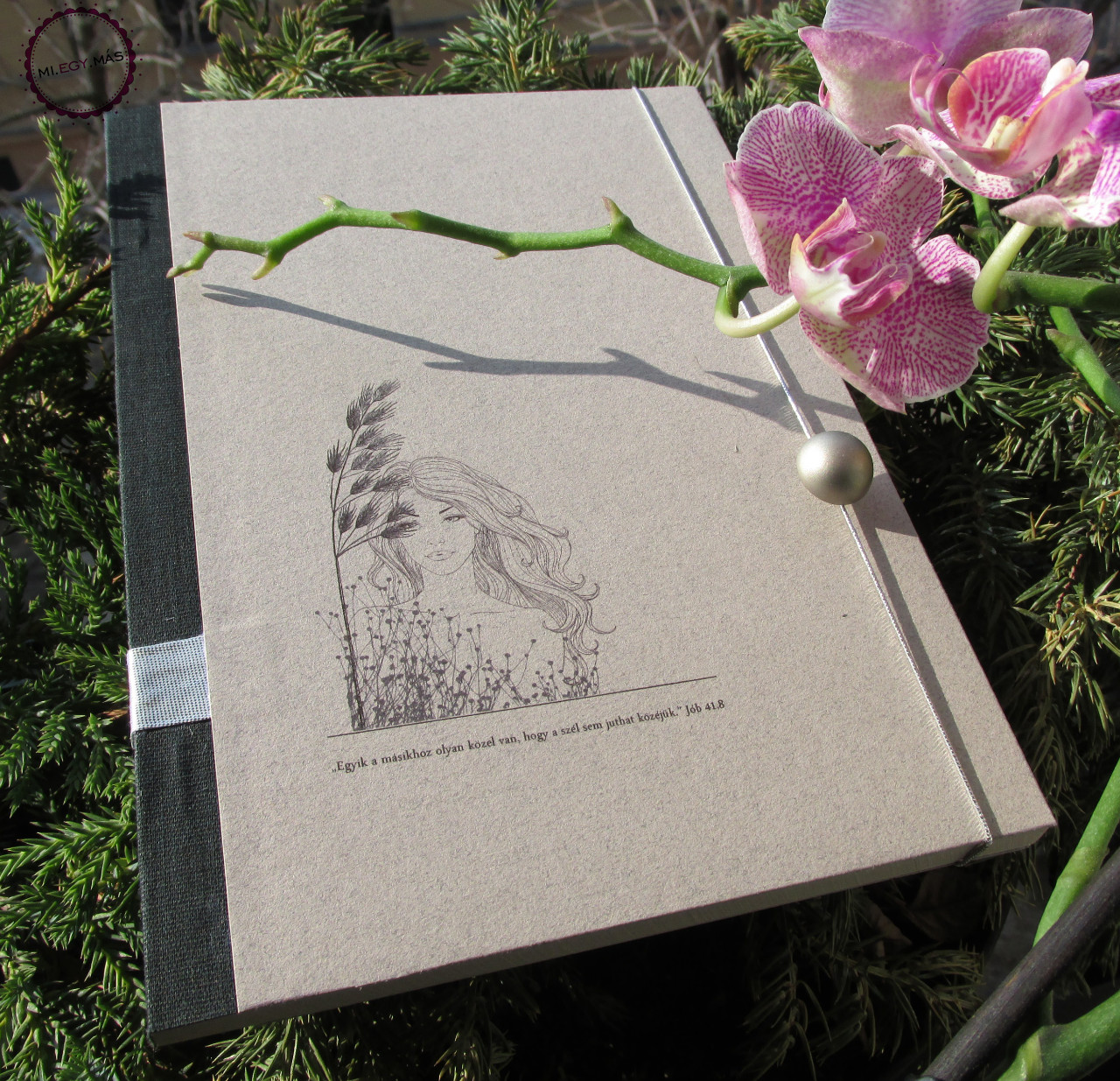Saját gondolattal nyomtatott, keményfedeles, ragasztott, textilgerincű és szatén szalaggal megköthető.